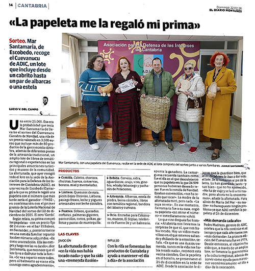 Mar Santamaría Guevara recibió el premio del sorteo del Cuevanucu Cántabro de Navidad del 2025. El acto estuvo cubierto por el Diario Montañés, y Blanca Carrera, miembro de la Junta Directiva de ADIC, fue la responsable de realizar el acto protocolario de la entrega del premio. La afortunada ganadora, vecina del munipio cántabro de Escobedo de Camargo, estuvo acompañada de su familia.