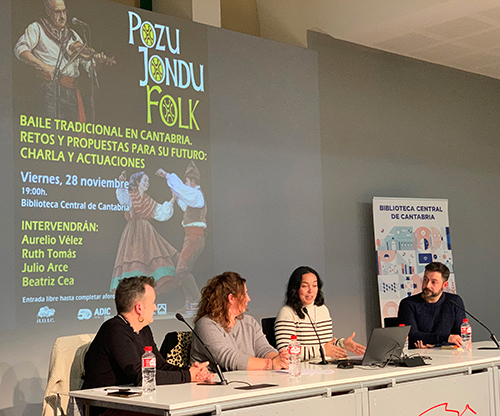 Con una animada charla en la Biblioteca Central de Cantabria, bajo el título de “Baile tradicional en Cantabria. Retos y propuestas para su futuro", se inició una nueva edición del Festival Pozu Jondu Folk organizado por la Asociación ADIC. La mesa redonda trató el estado actual del baile popular en Cantabria, además de incidir en qué actividades se están llevando a cabo para su promoción. El director del Grupo Etnográfico Brañaflor, Aurelio Vélez; la conservadora-restauradora de Bienes Culturales e investigadora y divulgadora del Patrimonio Inmaterial cántabro, Beatriz Cea; el director del Grupo de Danzas San Sebastián de Reinosa, Julio Arce y la profesora de Educación Infantil y Primaria, Ruth Tomás, fueron los encargados de ahondar en qué otras propuestas pueden favorecer el contacto de toda la sociedad cántabra con su patrimonio inmaterial y, más concretamente, con los bailes tradicionales.